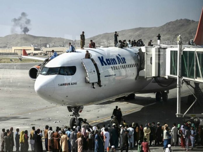 Las multitudes convergían en el aeropuerto intentando escapar y algunos hasta llegaron a colgarse de un avión de transporte militar estadunidense cuando avanzaba por la pista, según imágenes publicadas en las redes sociales.