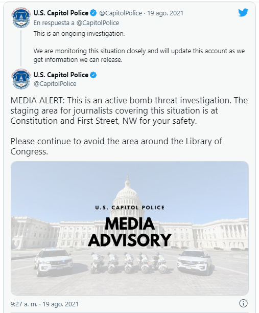 Un hombre dentro de una camioneta aparcada fuera de la Biblioteca del Congreso estadounidense en Washington ha alertado este jueves por la mañana que tiene una bomba. La policía del Capitolio está negociando con el sospechoso y ha evacuado varios edificios en las inmediaciones del centro de la ciudad, donde se ubican el Congreso y el Tribunal Supremo. Los congresistas no están en sus oficinas porque la Cámara de Representantes está en receso por vacaciones esta semana. Las fuerzas de seguirdad han enviado francotiradores al área después de que los agentes vieron al sospechoso con un objeto que parecía ser un detonador, según la agencia AP.