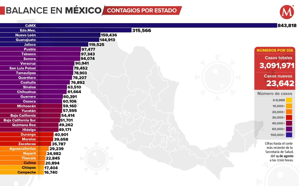 Por el contrario, Chihuahua, Aguascalientes y Tlaxcala son los estados con menor número de contagios de coronavirus, con 764 mil 914 y mil 94, respectivamente.