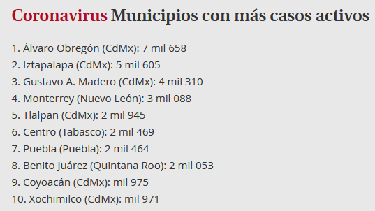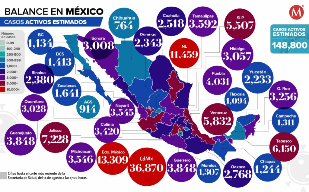 La Ciudad de México es la entidad con mayor número de casos positivos por covid-19, con 36 mil 870; le sigue el Estado de México, con 13 mil 309 casos; en tercera posición se encuentra Nuevo León, pues cuenta con 11 mil 459 casos activos.