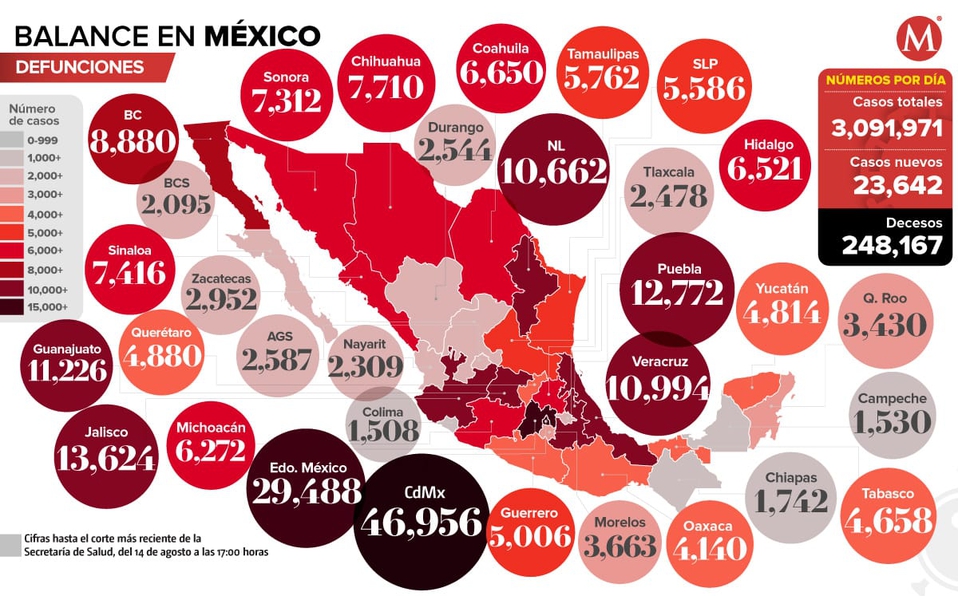 Finalmente, por el contrario, Colima, Campeche y Chiapas son los estados con menos muertes causadas por covid-19, con mil 508, mil 530 y mil 742, respectivamente.