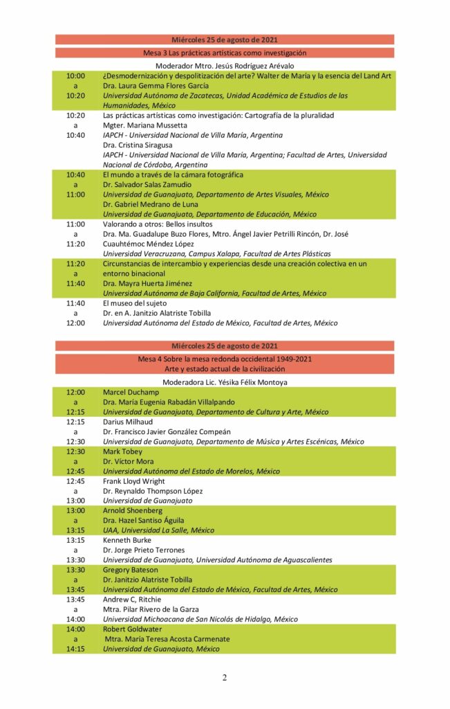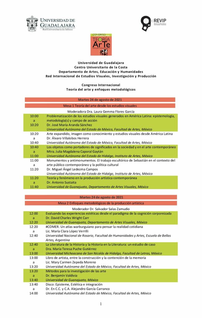 Por último, el Doctor Edmundo Andrade comentó que se abordarán temas en el campo de la teoría del arte y en particular a enfoques metodológicos de la producción artística. Las Transmisiones de las ponencias del Congreso Internacional Teoría del Arte y Enfoques Metodológicos de la Producción 2021, son abiertas y gratuitas para estudiantes, profesores investigadores y público en general, y a través de la página Facebook del CUCosta.